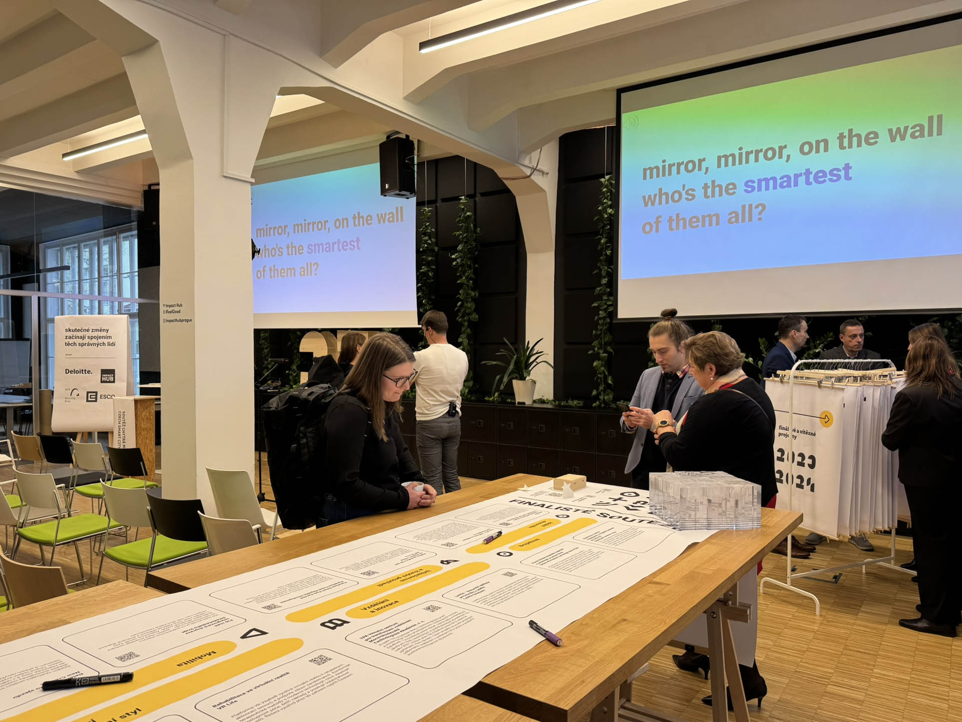 Slavnostní vyhlášení vítězů soutěže se uskutečnilo v úterý 25. listopadu. Pražská pobočka IMPACT HUBu poskytla celé akci, která pozvolně začínala už ve 13:00, naprosto perfektní zázemí. Organizátoři neponechali nic náhodě a připravili pro všechny účastníky skvělý program, který vytvořil ideální prostor pro neformální diskuse. Bylo inspirativní potkat se na jednom místě s dodavateli technologií a inovátory, kteří sdílejí stejnou vizi o efektivnějším fungování našich měst.